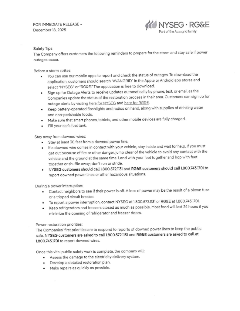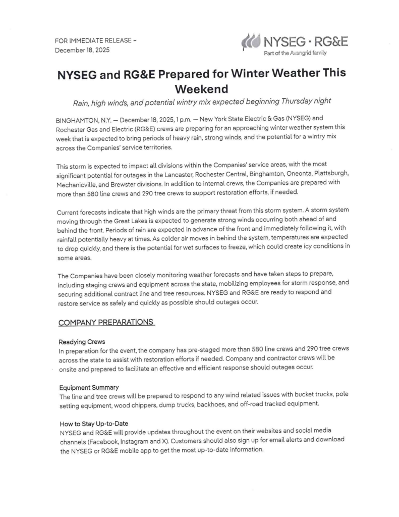 NYSEG and RG&E Prepared for Winter Weather This Weekend